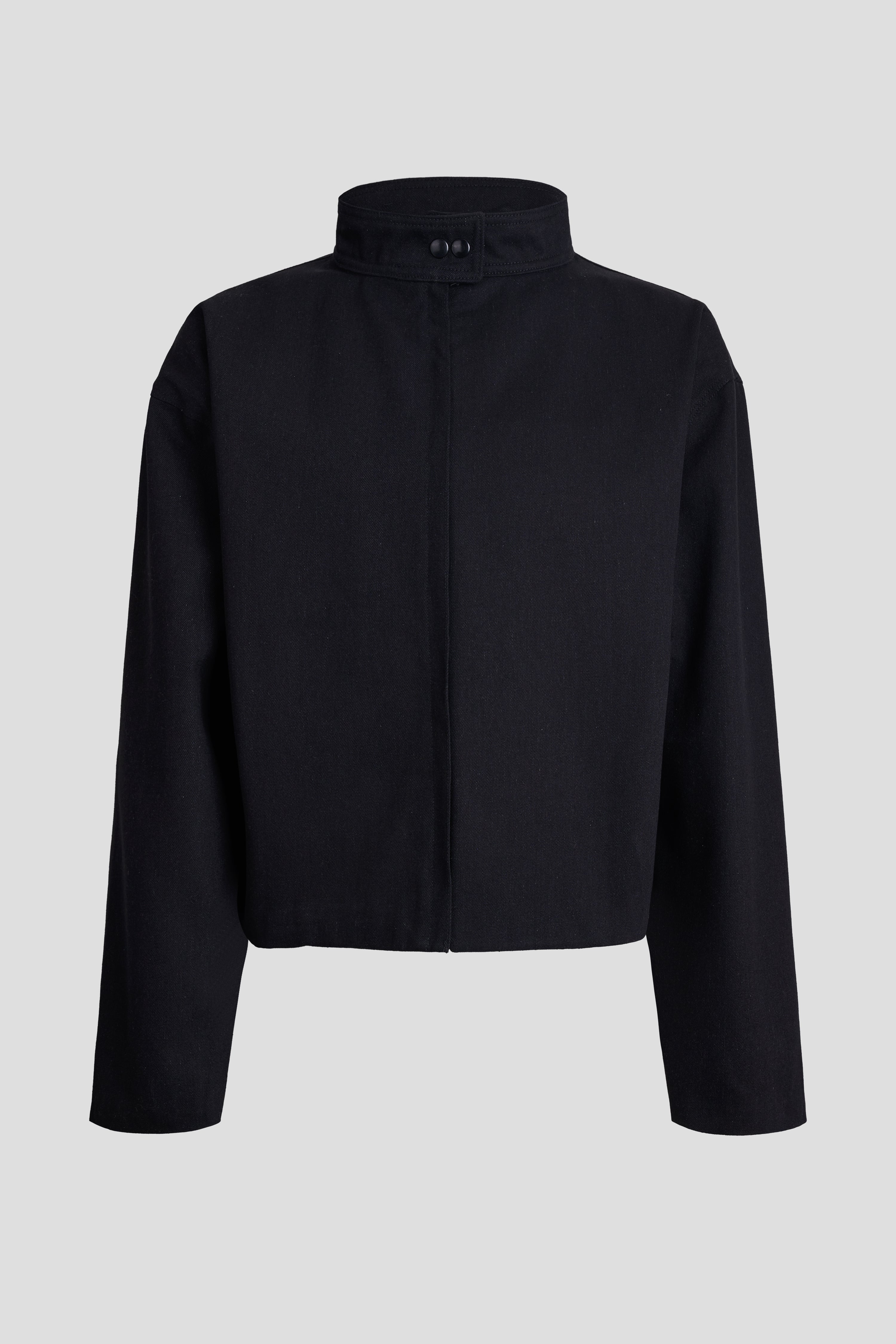 JACKET: STRAIGHT-CUT DENIM JACKET WITH FRONT ZIP CLOSURE AND SNAP BUTTON.
