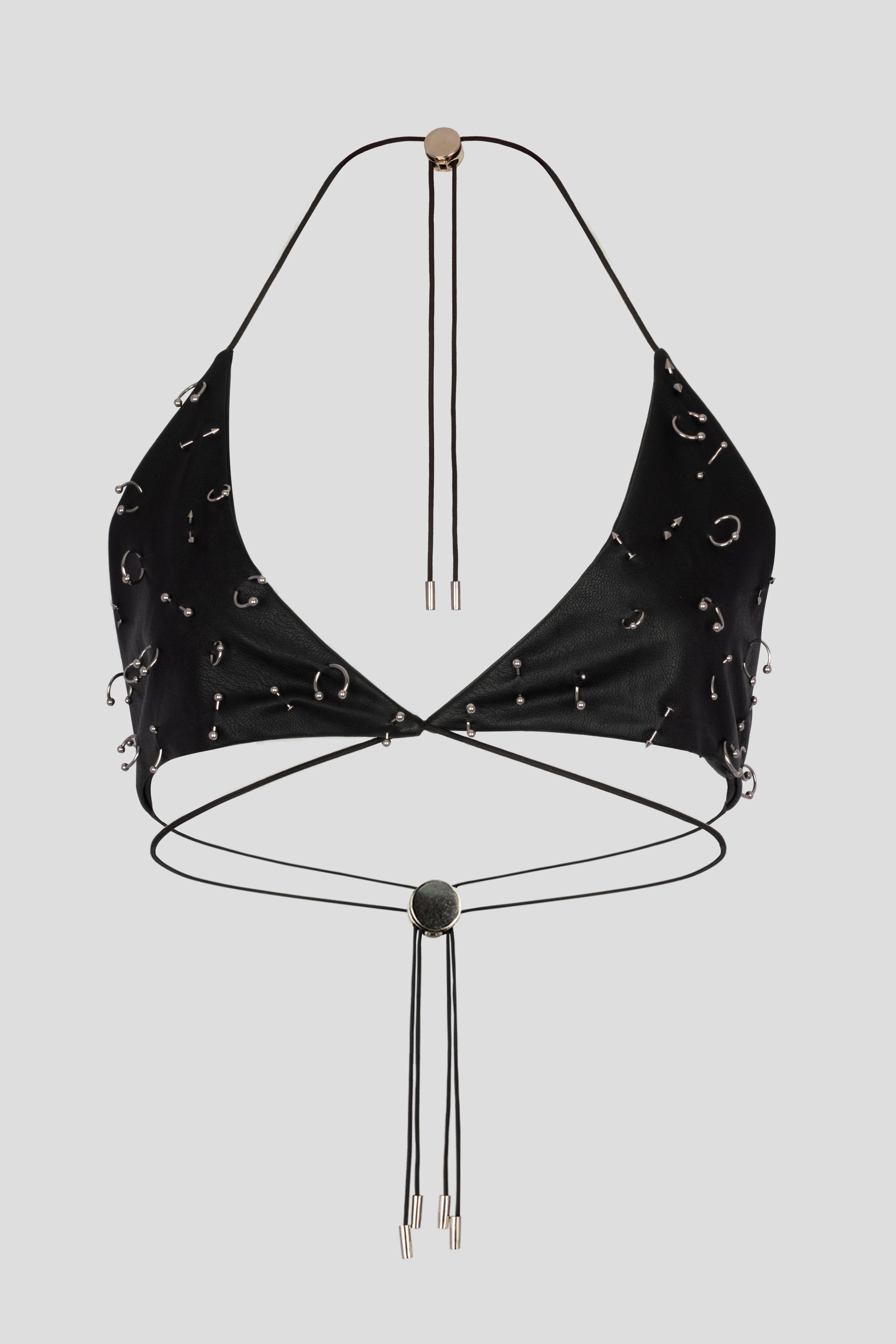 TRIANGULAR BLACK VINYL SKIN TOP, WITH PIERCINGS IN THE CUP AND CROSSING SIDE, WITH COKERS IN THE BACK TO ADJUST.
